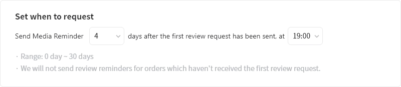 Set when to send the Media Reminder. It is set based on the time when the First Review Request was sent. The range of days is from 0 to 30 days, and the time can be set among 08:00, 13:00, 19:00, and 21:00.