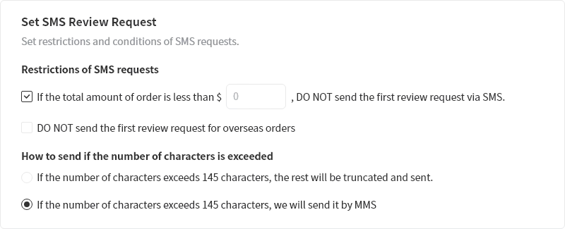 If the total amount of the order is less than $___, DO NOT send the Media Reminder via SMS: If this option is selected, we do NOT send SMS requests to the orders with amounts under $___.