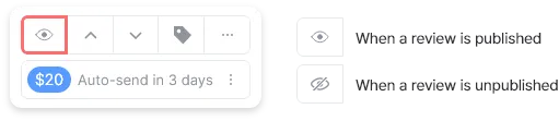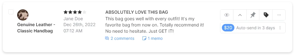 The actions you can make on the review are to publish/hide it, pin it on the top or bottom, label it, and reward it.