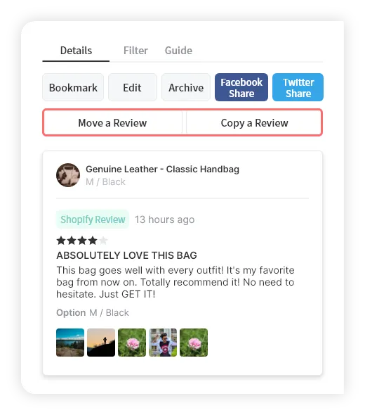 You can copy a review to other products. Copied reviews will be displayed both in original product and the copied products.