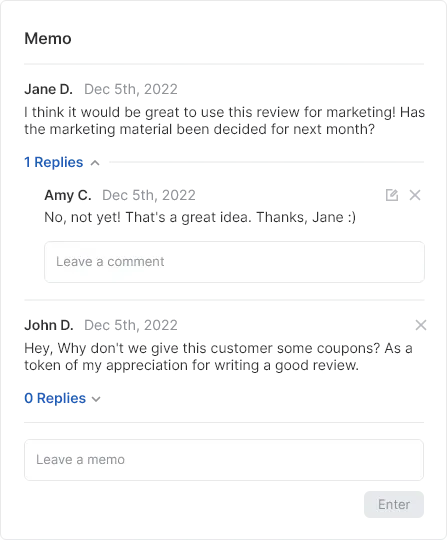 Managers can write a memo in review and comment on other managers' memos. When you need to communicate with other managers regarding reviews, it is good to use.