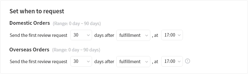 You can set when to send a request based on the fulfillment or order date. The range of days is from 0 to 90, and the time can be set among 08:00, 13:00, 19:00, and 21:00.