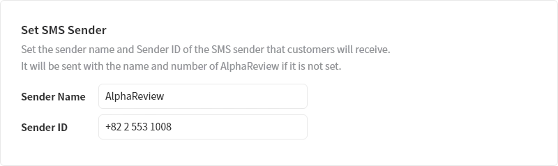 Set the sender name and Sender ID of the SMS sender that customers will receive. It will be sent with the name and number of AlphaReview if it is not set.