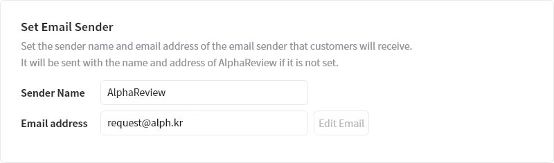 Set the sender name and email address of the email sender that customers will receive. It will be sent with the name and address of AlphaReview if it is not set.