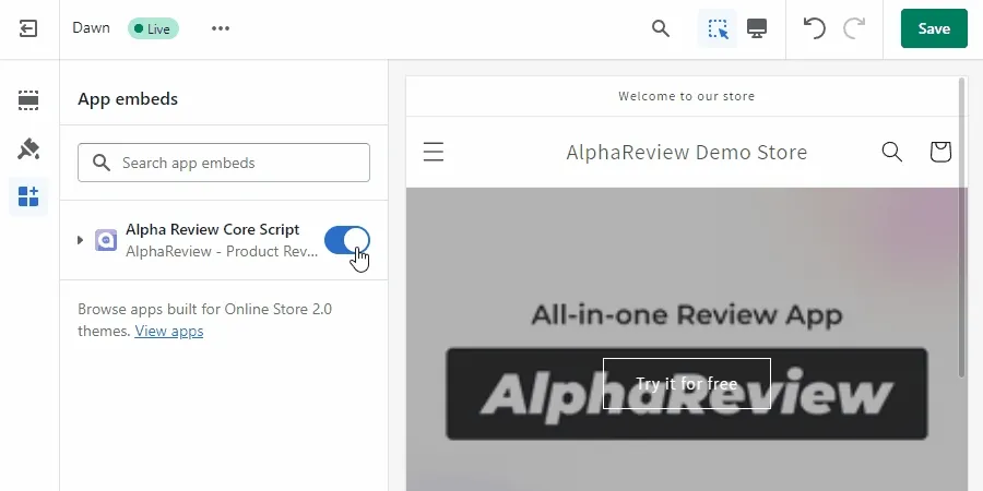 Check if AlphaReview Core Script is enabled in the App Embeds tab. This is necessary for the widgets to function properly.