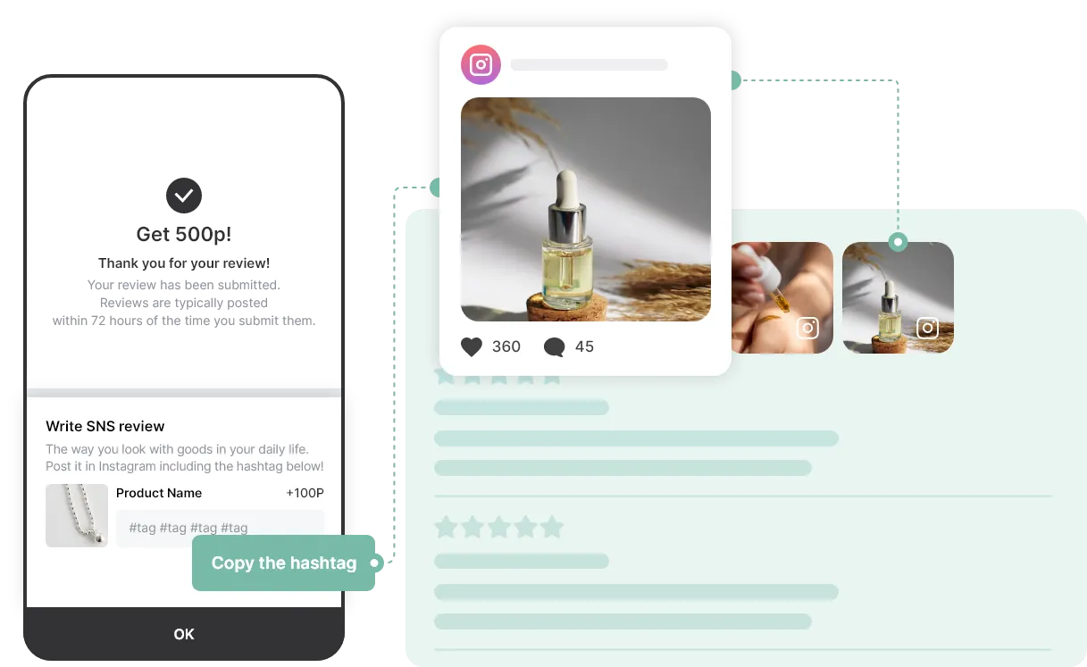 AlphaReview encourages customers to write not only basic product reviews but also social reviews. Our platform allows customers to leave reviews on Instagram, and we automatically display these reviews on your online store.
