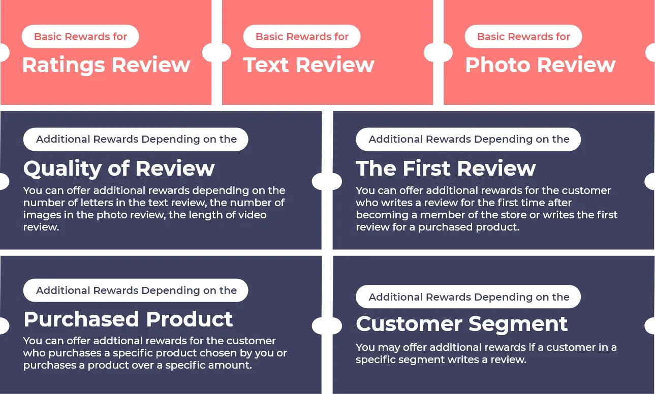 Incentivizing reviewers is an excellent way to get more high-quality reviews. With AlphaReview, you can set reward values differently by customer groups, review types, review quality, and order and product amount range.