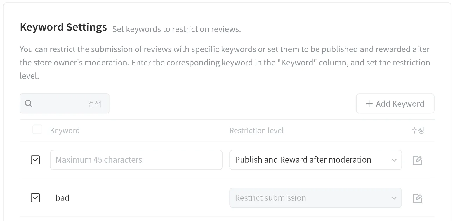 Publish and Reward After Moderation: For the keyword set at this restriction level, a customer is allowed to submit the review that includes the keyword, but the review can only be published or rewarded after the store owner checks it.