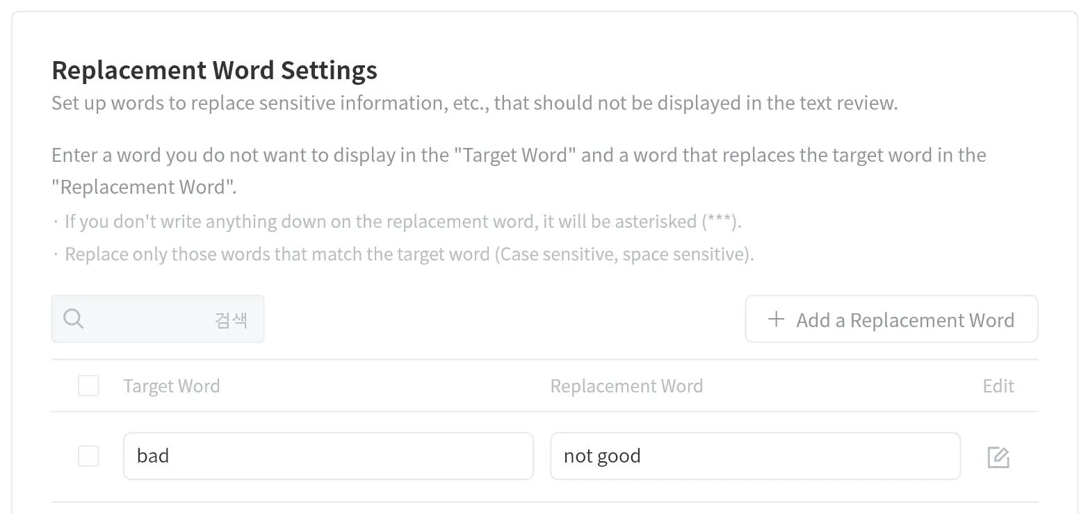 You can set up words to replace sensitive information, etc., that should not be displayed in the text review. You can choose either to asterisk the word or to replace it with another word.