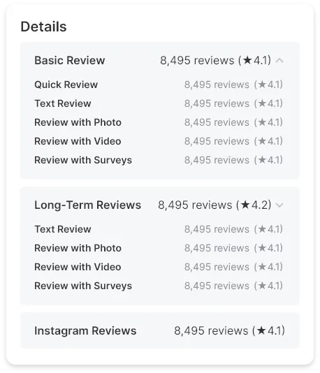 Basic reviews: Quick reviews, text reviews, reviews with photos, reviews with videos
