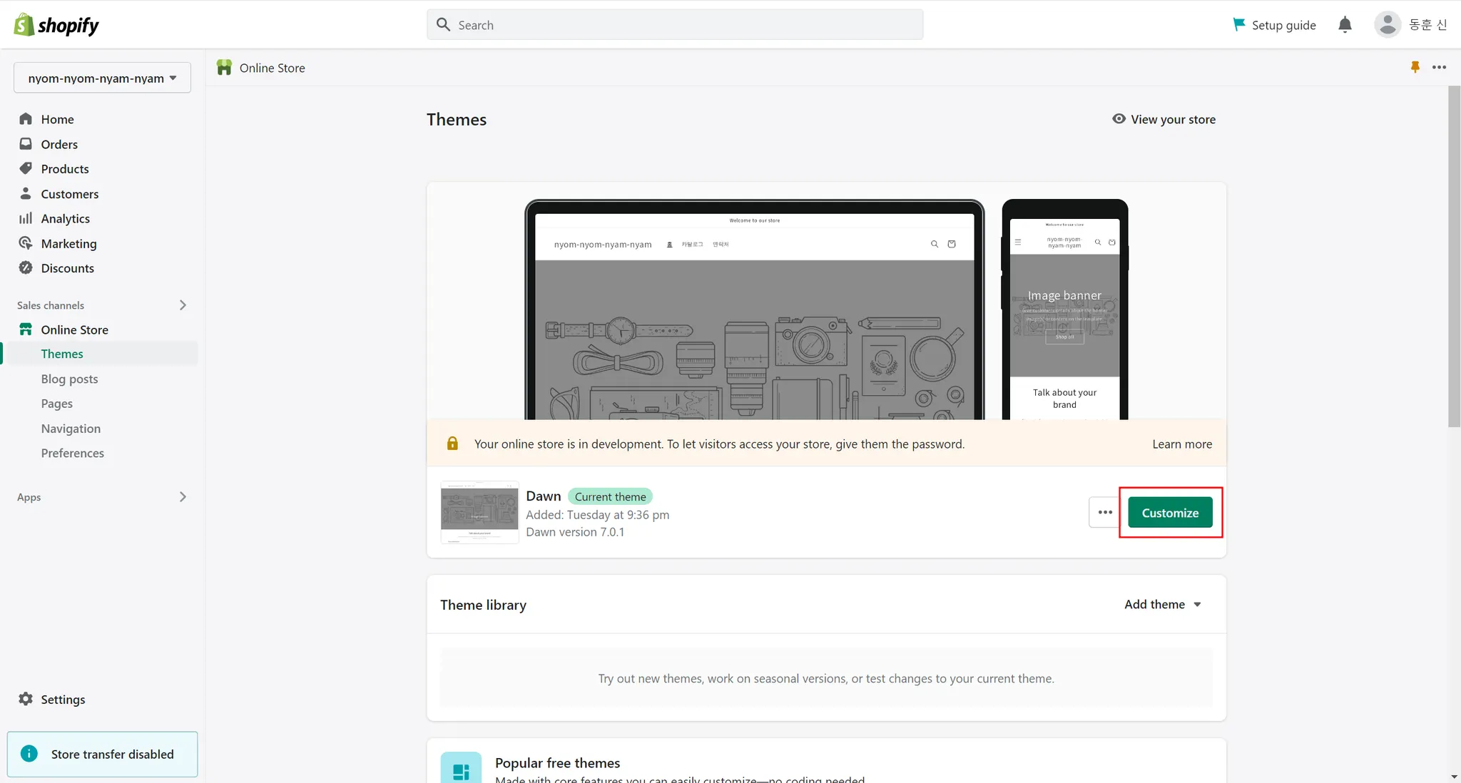 Login to your Shopify admin account, then go to Online Store → Themes → Customize.