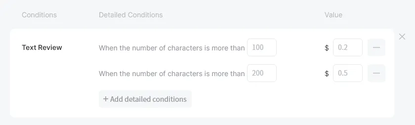 If it is set as shown in the image below, a customer cannot receive additional rewards if the number of characters of text review is less than 100. When the number of characters is more than 100 and less than 200, a customer can get a $0.2 additional reward; when the number of characters is more than 200, a customer can get a $0.5 additional reward.