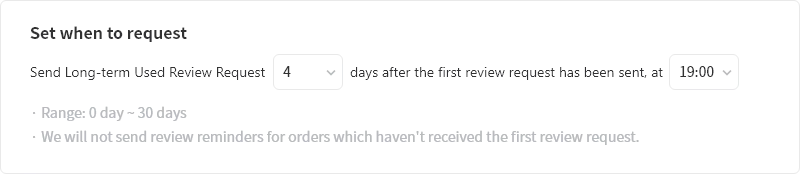 Set when to send the Long-term Used Review Request. It is set based on the time when the First Review Request was sent. The range of days is from 14 to 365 days, and the time can be set among 08:00, 13:00, 19:00, and 21:00.