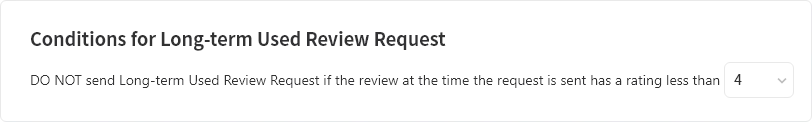 For more positive reviews, it is recommended to send long-term review requests only to customers who are already satisfied with the product. Therefore, AlphaReview provides the feature to send the Long-term Used Review Request only if the ratings of the basic review are above a particular rating.