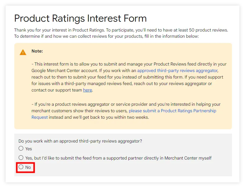 In the form, you should select "No" for the question "Do you work with an approved third-party reviews aggregator?".