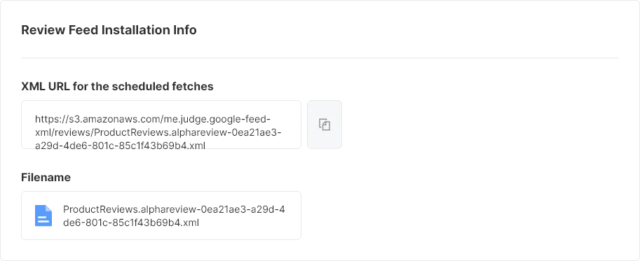 Copy the file name and file URL from AlphaReview admin [SEO&Integration > Google Shopping > Review Feed Installation Info] and paste them into the required fields.